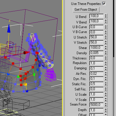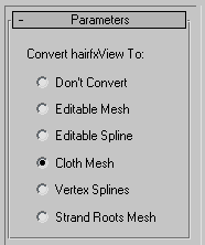 Конвертируем их в Cloth Mesh. После этого мы можем применять модификаторы как к обычному мешу. Применяем Cloth FX. Сначала в свойствах указываем, что это ткань. За тем заходим в подобъект Group и выделяем корни волос. Задачка не из легких, я для этого использую Paint Selection. Просто крашу, выделяя все вершины, включая нужные, потом крашу, снаружи снимая лишнее выделение и оставляя только нужные вершины выделенными. В более поздних версиях Cloth FX в подобъекте Group появляется кнопка Get, она позволяет выделить корни волос одним кликом.