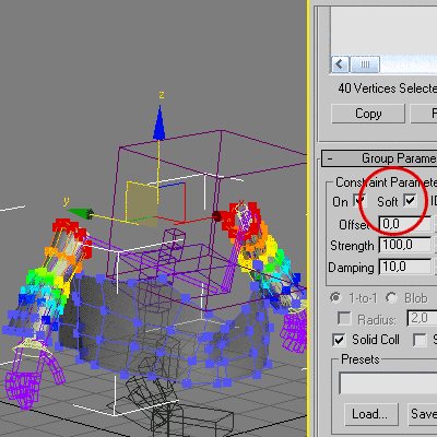 Мне не нужно, чтобы ткань болталась слишком интенсивно, для этого я теперь делаю мягкие группы. Делаем выделение, как и в первой группе (можно прямо кликнуть на первой группе в списке и точки выделятся сами), создаем новую группу и называем ее «Coat SOFT». На эту группу не назначаем никакого действия. Но в настройках активируем галку Soft Selection, настраиваем его как надо и настраиваем свойства такни этой группы. Нам нужно сделать ткань в этом месте жестче, в этом здорово помогают настройки Bend и Shear. Bend выкручиваем до 100, а Shear аж до 1000. С этими параметрами можно спокойно экспериментировать, достигая нужного результата. Ставим галку Use These Properties, иначе эти свойства не будут включены.