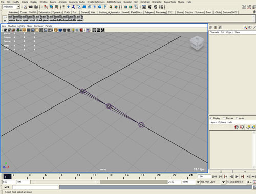 Начнем по-порядку. Делаем систему из трех костей в начале координат по оси X ( для наглядности мы пока опустим кисть )