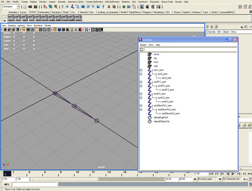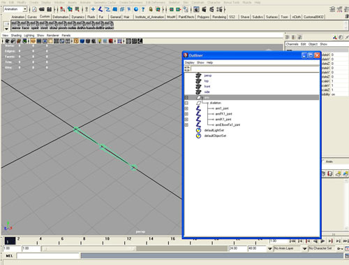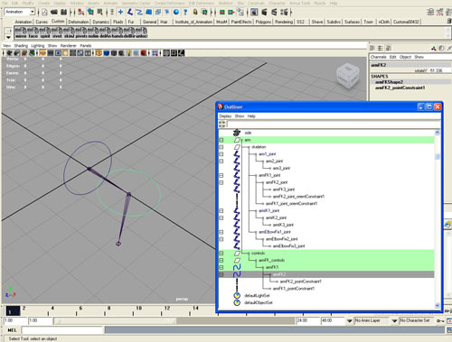 Щелкаем по первой кости (armIK1_joint) в окне проекции,а затем по последней (armIK3_joint).