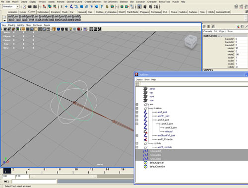 Давайте скроем все, кроме системы armFK1_joint. Сделаем элементы управления системой FK в виде NURBS-кружков.