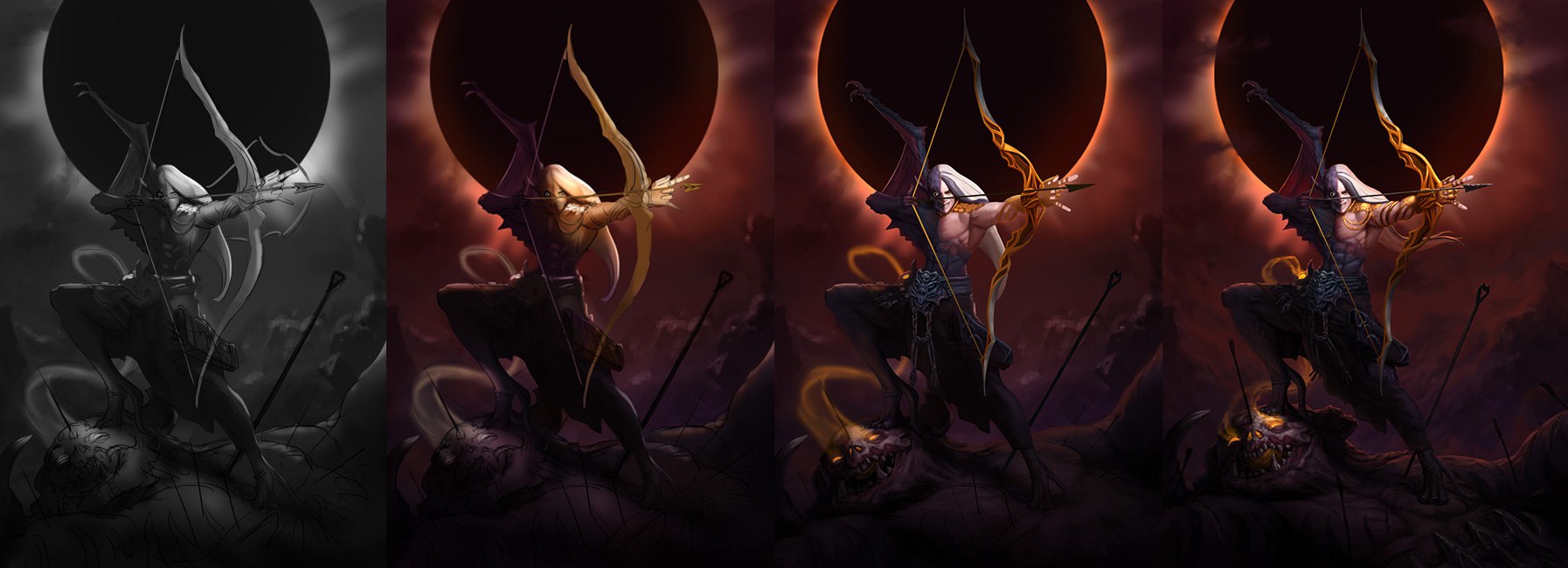 Наброски. Первым делом я сделал ряд маленьких набросков. Выбрав наиболее подходящий, немного проработал его тоном, чтобы посмотреть где можно поставить акценты. Хотелось создать мрак от затмения и не потерять фокус на главном герое.