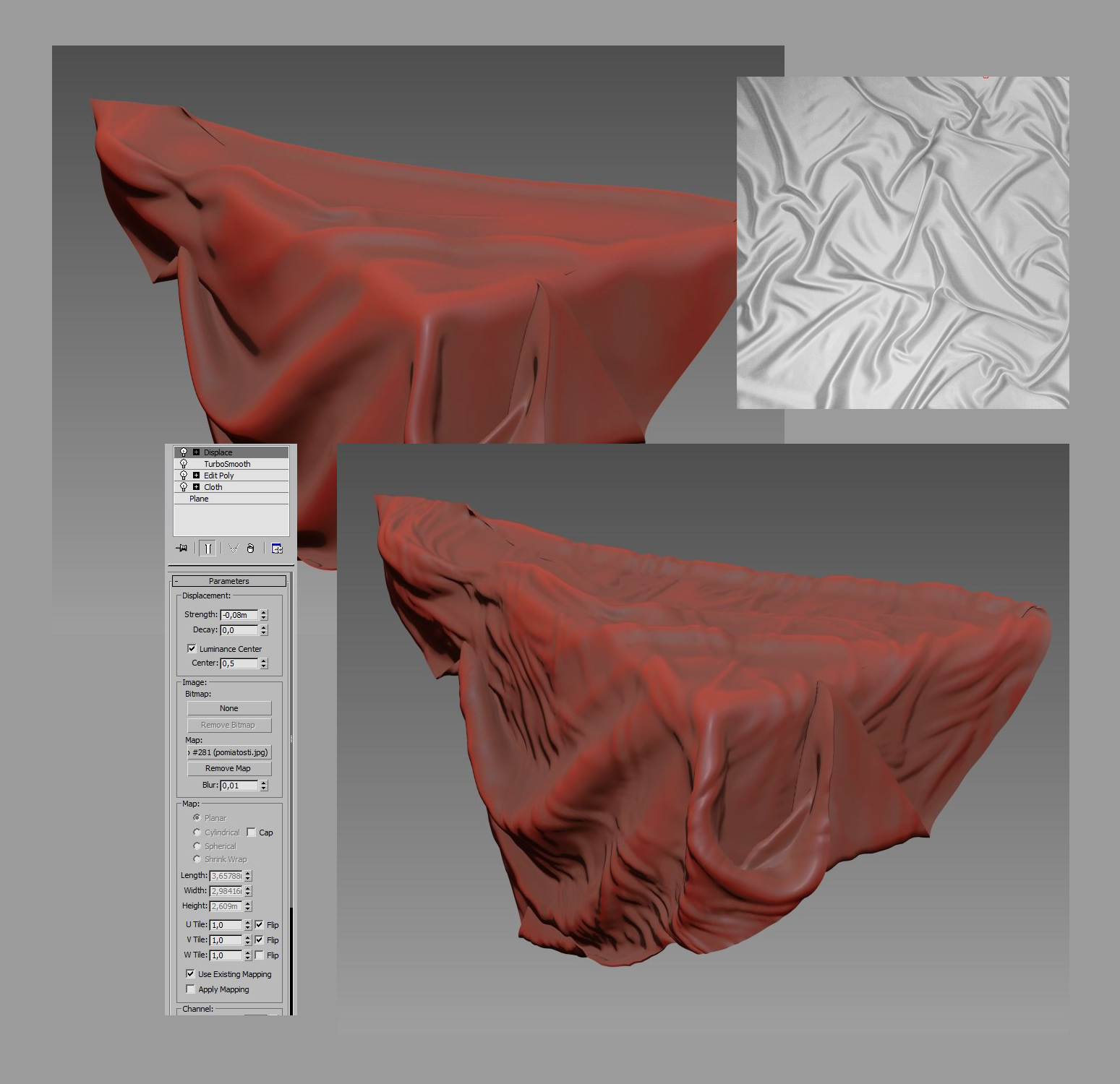 В работе с тканью я использовал модификатор Gloth, после симуляции я захотел создать еще больше деталей для ткани в виде мелких складок. Я хотел создать этот эффект с помощью материала и настроек карты Bump, но это не давало нужный рельеф. Затем я использовал VRayDisplacementMod, но результат можно было увидеть только на рендере. Более удобным и быстрым решением было использование модификатора Displace, он использует больше памяти, но результат сразу можно увидеть во вьюпорте. Это очень удобно, так как уже на стадии моделирования вы видите как геометрия ткани реагирует с другими объектами, к примеру веревками и креплениями. Хочу отметить высокую скорость просчета с использованием Displace в 3ds max. Моих 16 гигабайт оперативно памяти хватало для комфортной работы над всей сценой.