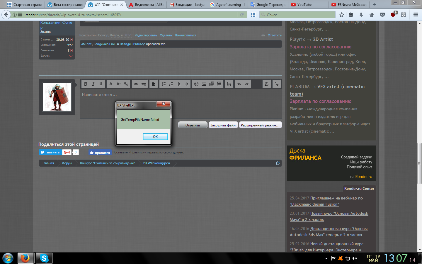 До него все было нормально. Потом еще с одним комментарием случилась такая же ошибка, но я забыл, с каким именно. После этого я вышел из учетной записи, вошел в нее снова и попробовал снова "+1" - на этот раз все сработало. Т. е. ошибка наблюдалась до выхода из учетной записи и после нескольких корректных срабатываний.