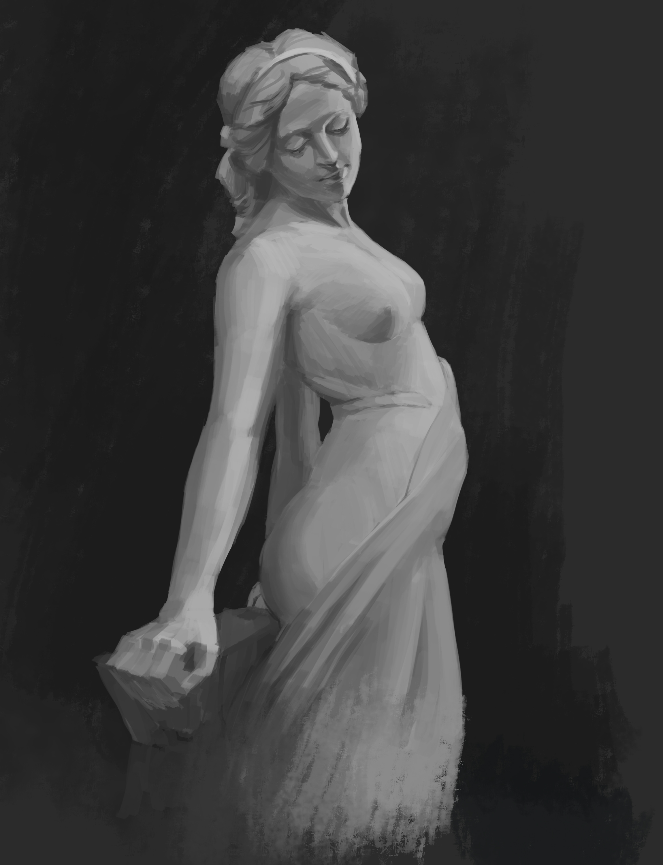 очень серая получилась, надо в целом высветлить сейчас картинку, там где падающие тени и оклюжены оставить как есть, на свету надо минимум в два раза высветлить. Самое темное место будет там где тень от головы и волос.