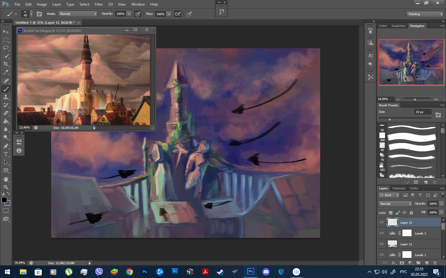 Используй вспомогательные направляющие, что бы показать зрителю что у тебя главное. Используй разницу масс. Если взять и поделить примерно твою башню и город - они по массам будут одинаковые и более того, почти симметричные. Не делай много прямых горизонтальных или вертикальных линий, они обрезают на пополам твою композицию - закручивай их по спирали, делай наклоны но не допускай что бы такие вещи встречались в работе. Избавляйся от симметрии, это однообразно. Тебе нужна разность масс (балансовая композиция). Я сделала очень быстро, но здесь есть отбор. Как видишь более менее какие то детали есть на замке с фигурами + за счет цвета я выделила мосты по краям что сводят композицию в центр к фигурам. А все остальное я приглушила и опустила. Тебе нужно что то подобное сделать, только в своем стиле). Цвет и свет - очень мощные элементы композиции, они могут как спасти работу так и убить её напрочь. А и да, макушка предмета не должна касаться края листа. Или пересекай башню пополам и что то делай или делай ниже. Как только предметы начинают упираться во что то - привет композиция, слишком мало места. Передвигай,убирай, делай несколько вариантов в миниатюрах а потом с миниатюр прям и рисуй.