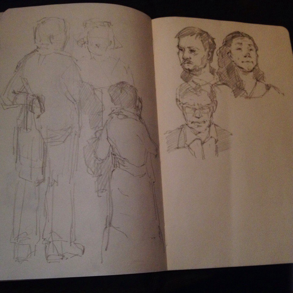 Ну и еще, здесь же, всякие зарисовки людей, их мало. Рисую обычно в электричке, потому что в метро люди пристают и пытаются выведать, что же я там такого нарисовала-то. А в элках им лень подходить, все как вареные кильки сидят и смотрят в окошки, да гаджеты.