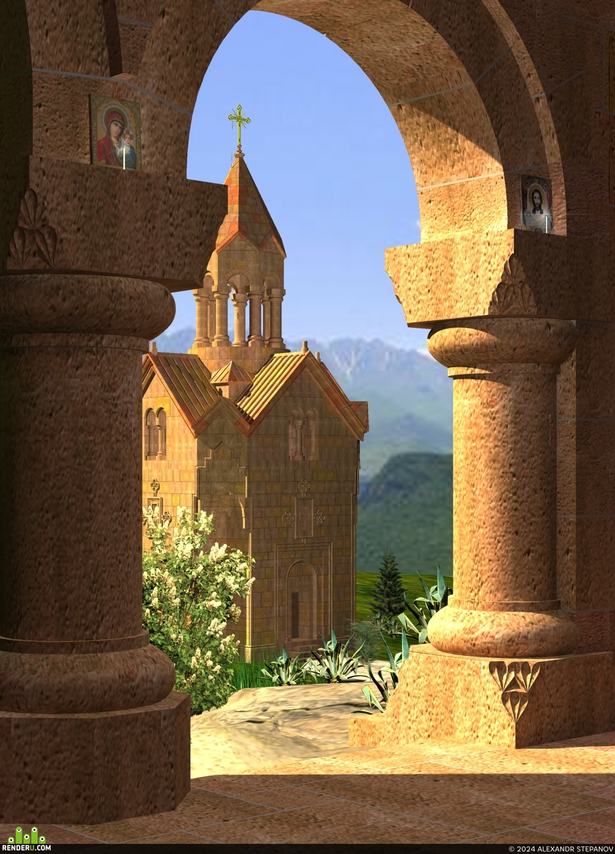 Так же, если в общем, и, цвет и свет вроде бы на месте. Если бы делал профессионал, то, наверное он так бы всё и поставил : вот эти тени под аркой, голубое небо, горы в дымке, и, освещённый солнцем (утренним ?) храм.