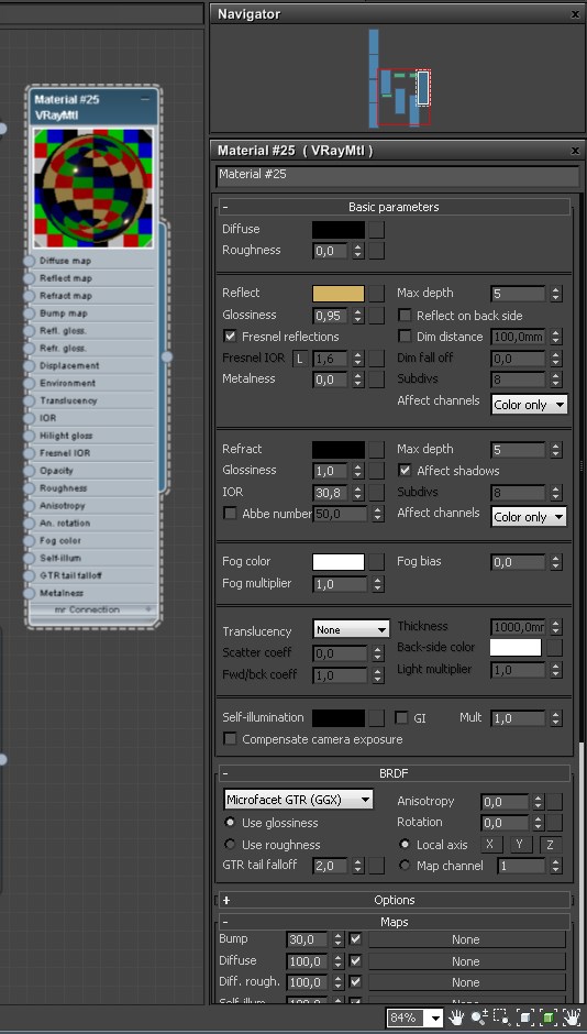 Там неактивный параметр Fresnel IOR, кнопочку L у него нажимаем, снимаем блокировку и вместо 1,6 ставь 30.