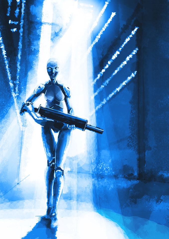 Sci-fi девушка интересная в плане пятен, но поза всё портит - она выглядит хромой, нет впечататление грации и угрозы от киборга, к-й идет прямо на зрителя. И края силуэта девушки