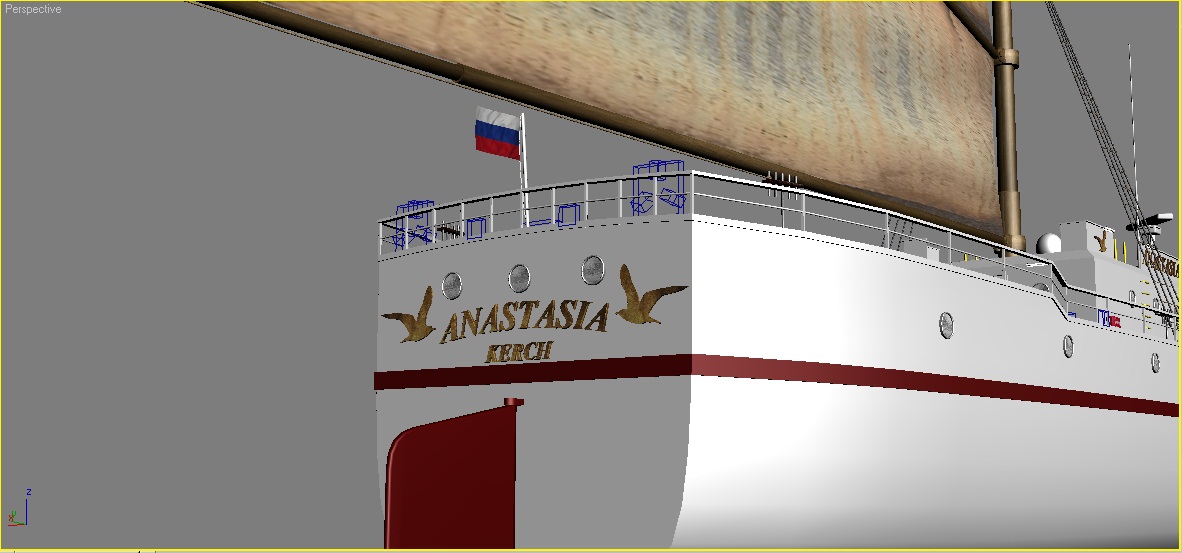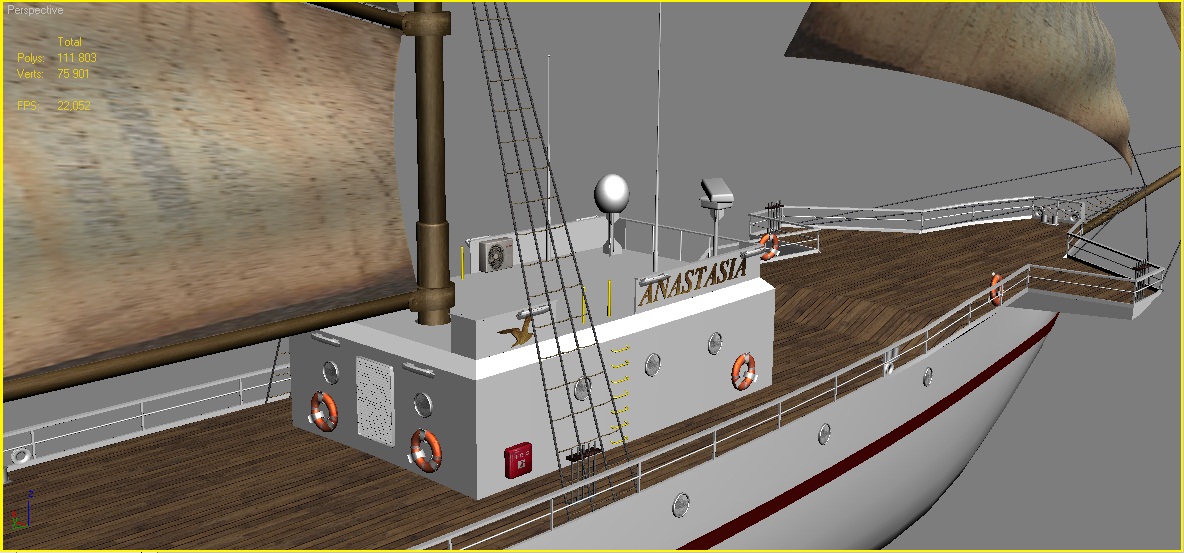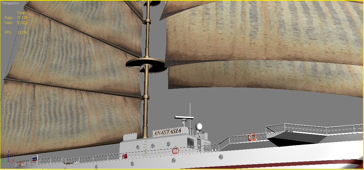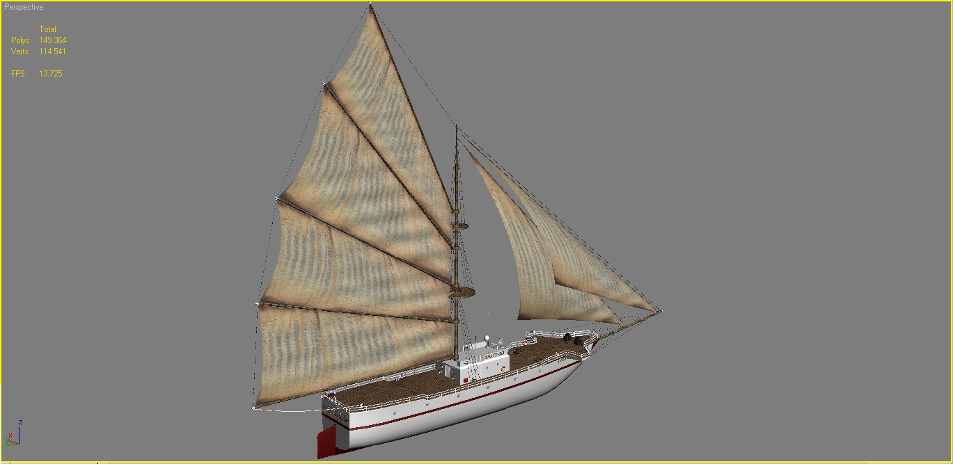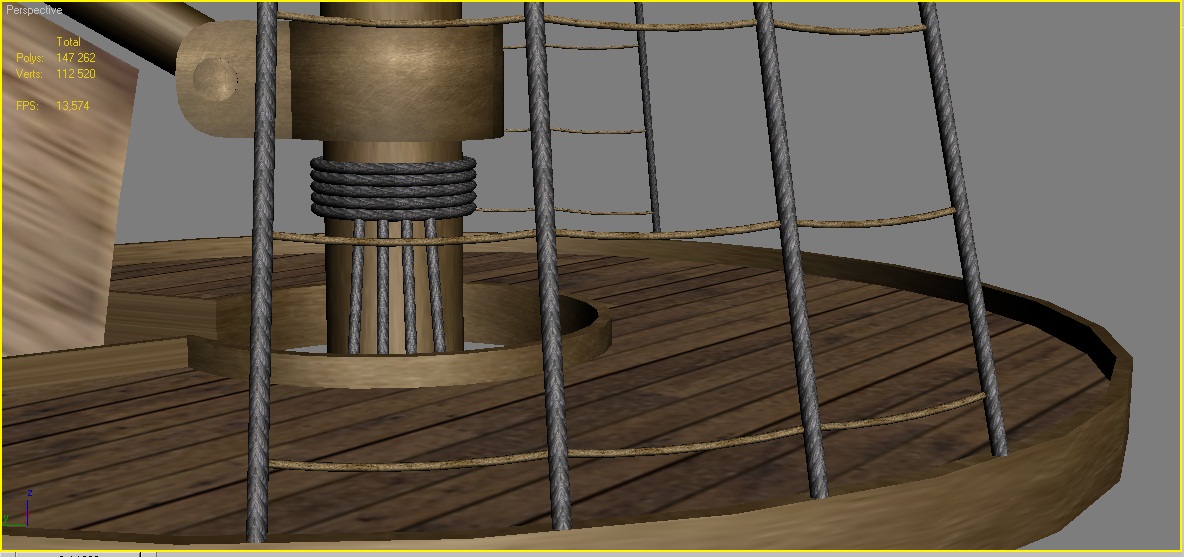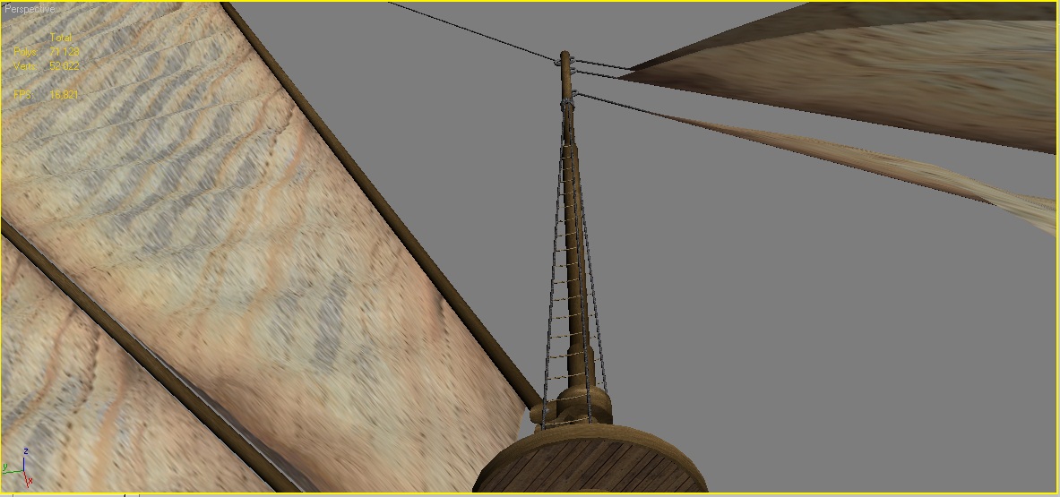 Спасибо за то, что интересуетесь моей работой. Текстура паруса это фото моей шторки из каюты=) накидываю по возможности текстуры и материалы сразу. В прошлый раз из-за этого и бросил, намоделил, а потом представил что все это текстурировать...так что работа еще в процессе, есть еще идеи что сделать