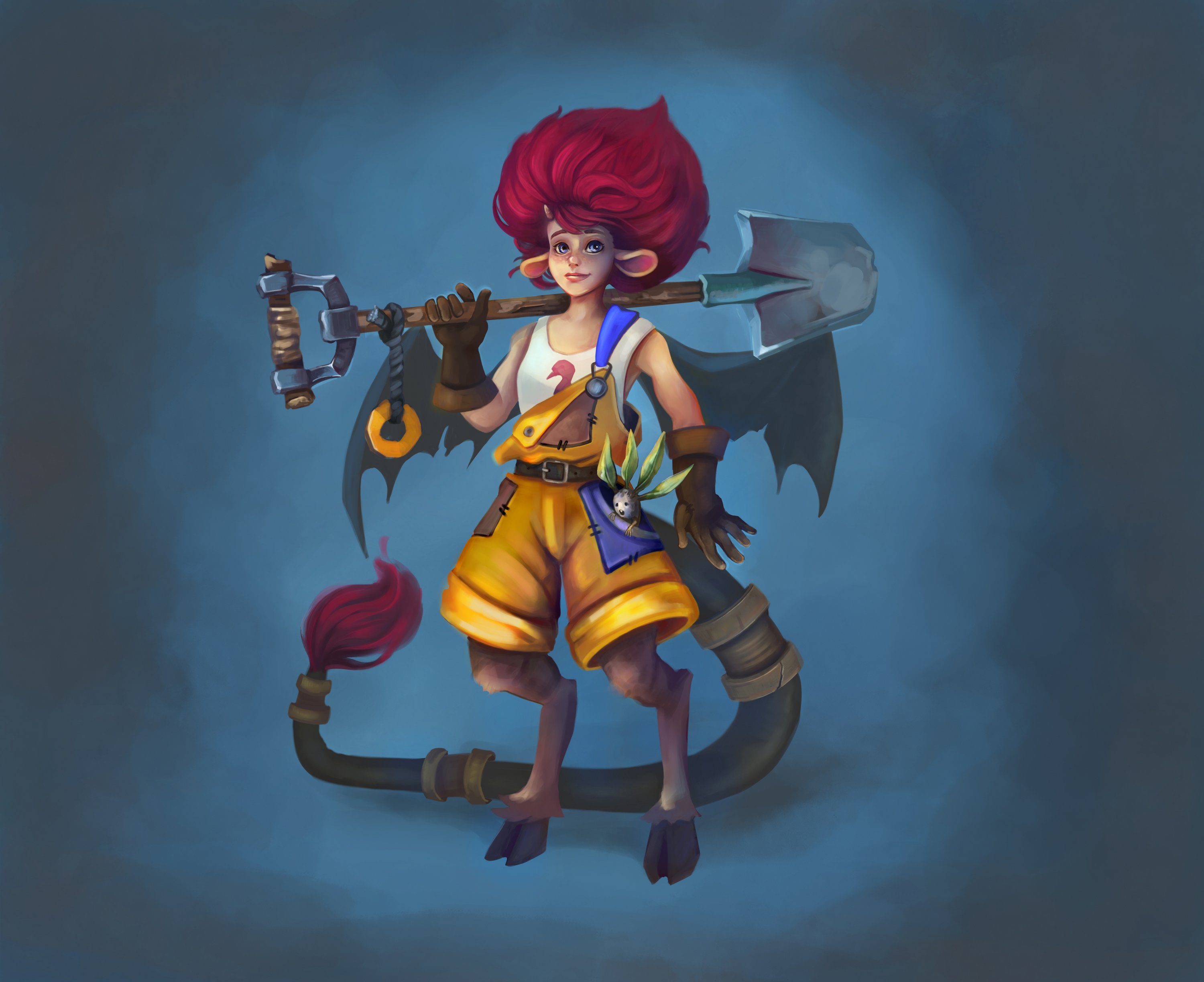 Некоторое время назад заморочилась на тему изобразить демоненка. Но здесь я попыталась отойти от каноничного образа демона. Поэтому в голову пришло изобразить не злого властного демона, а милого демоненка, который живет своей вольной жизнью за городом, ухаживает за садом и лесом.